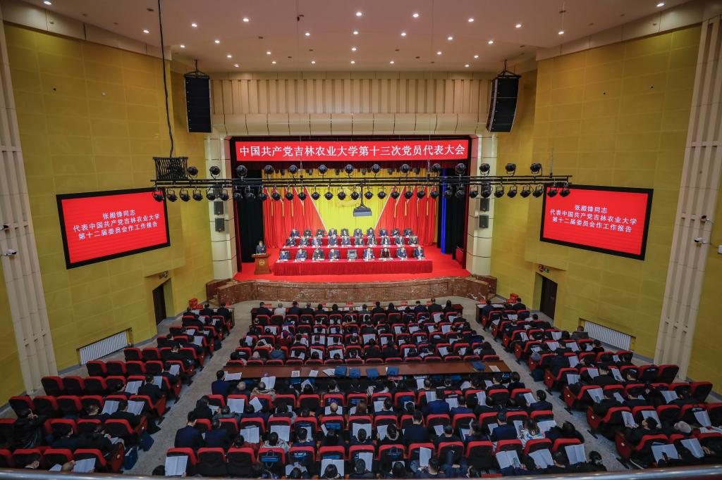 深冬的吉林农业大学校园银装素裹、玉树琼枝,鲲鹏学生文化活动中心礼堂气氛庄严、隆重、热烈。主席台上方悬挂着“中国共产党吉林农业大学第十三次党员代表大会”的会标。主席台正中的党徽熠熠生辉,十面红旗分列两侧。二楼眺台上悬挂着“高举习近平新时代中国特色社会主义思想伟大旗帜 为把学校建成国际知名高水平农业大学努力奋斗”的横幅,鼓舞人心、催人奋进。