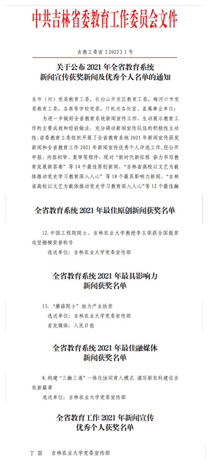 3月9日,中共吉林省委教育工作委员会下发《关于公布 2021 年全省教育系统新闻宣传获奖新闻及优秀个人名单的通知》,公布了全省教育系统 2021 年新闻宣传获奖新闻和全省教育工作 2021 年新闻宣传优秀个人评选结果,我校在此次评选中,包揽全部奖项。