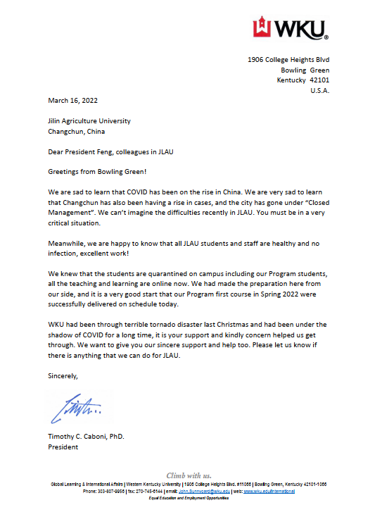 同日,美国西肯塔基大学校长蒂莫西C.卡博尼向我校发来慰问信。信中写到:近期疫情肆虐,吉林农业大学通过实施有效措施,充分保障了师生的安全。西肯塔基大学已为合作办学项目线上教学做好了充足准备,愿与我校共渡难关。