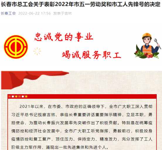 6月22日,长春市总工会下发《关于表彰2022年长春市五一劳动奖和工人先锋号的决定》,校长冯江荣获长春市五一劳动奖章。