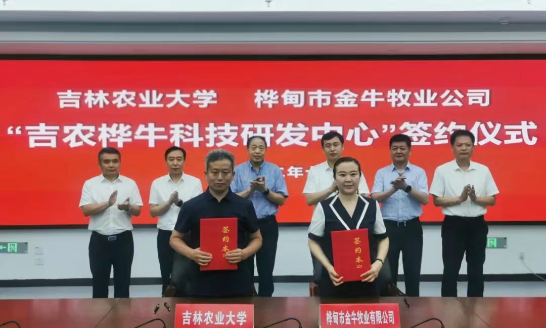 仪式上,与会人员观看了吉林农业大学和桦甸市宣传片。吕文发和赵士华分别代表吉林农业大学和桦甸市人民政府签订校地战略合作协议。学校动物科学技术学院、动物医学院教授杨连玉与桦甸市金牛牧业有限公司董事长潘淑红签订了“吉农桦牛科技研发中心”协议书。杜锐、穆晓东、胡立业、李亚南共同为“桦甸桦牛科技小院”揭牌,杜锐、吕文发、赵士华、潘淑红共同为“吉农桦牛科技研发中心”揭牌。