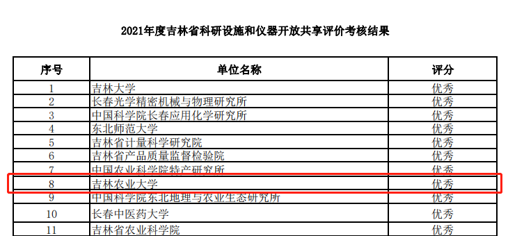 近日,由吉林省科技厅组织的2021年度吉林省科研设施和仪器开放共享评价考核中,我校凭借健全的管理体制机制及显著的开放共享成效,在此次考核中荣获“优秀”等级。本年度省内有66家高校和科研院所参评,考核结果优秀单位11个,其中有4所高校获评优秀等级,我校排名第3位。