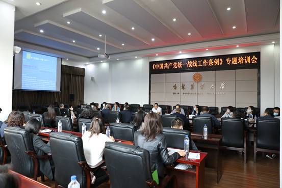 9月27日上午,学校在行政楼中五楼会议室举办《中国共产党统一战线工作条例》专题培训会。培训会上,长春市社会主义学院徐昂老师从背景意义、统战工作内涵、统战工作新要求,以及统战工作的方针和方法等方面对《中国共产党统一战线工作条例》进行了深入讲解。