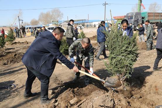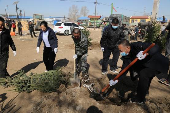 活动现场,所有成员三五人一组,分工明确,相互配合,搬苗扶苗、挥锹挖土、培土围堰、拉水浇灌,现场一派热火朝天的劳动景象。经过两个多小时的辛勤劳动,新栽种的树木整齐有序,迎风挺立,在和煦的春风中焕发出勃勃生机。