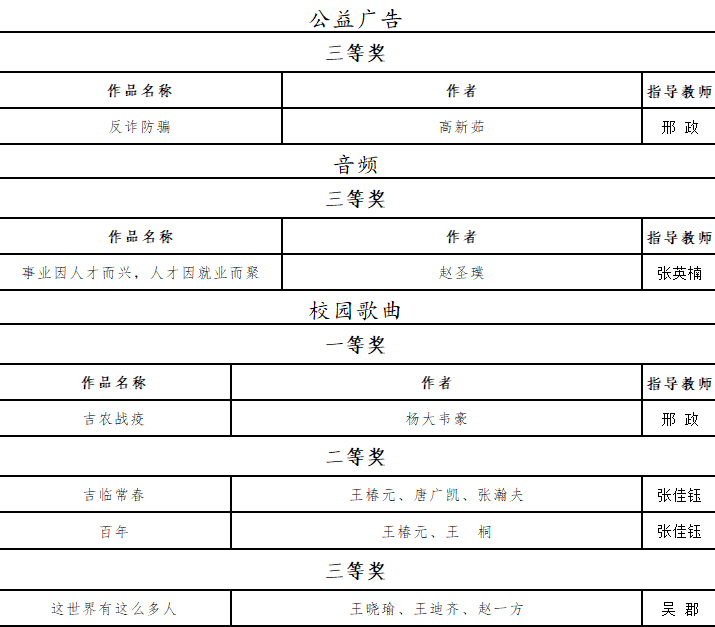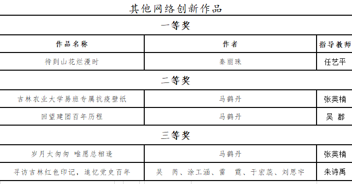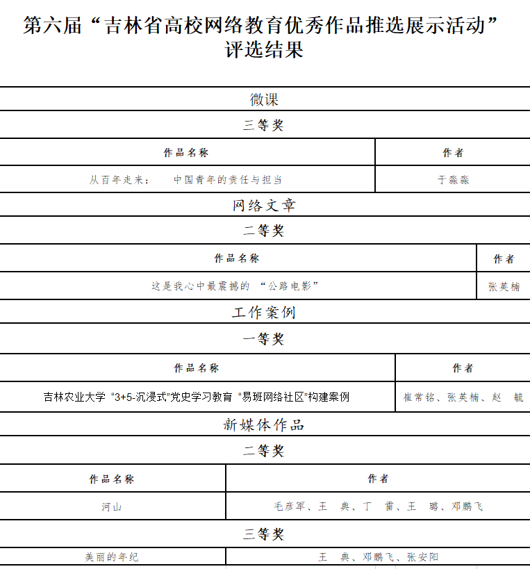 按照教育部《关于举办第六届全国大学生网络文化节和全国高校网络教育优秀作品推选展示活动的通知》(教思政司函[2022]7号)要求,省教育厅举办了第六届吉林省大学生网络文化节和全省高校网络教育优秀作品推选展示活动。共计收到全省高校报送的作品883件,包含2个方面13大类,经组织专家评审,形成了各类作品入选名单。我校精心组织参与,积极报送大学生网络文化作品、高校网络教育作品,共计31项师生作品获奖,其中,获各类作品一等奖8项,二等奖10项,三等奖13项。