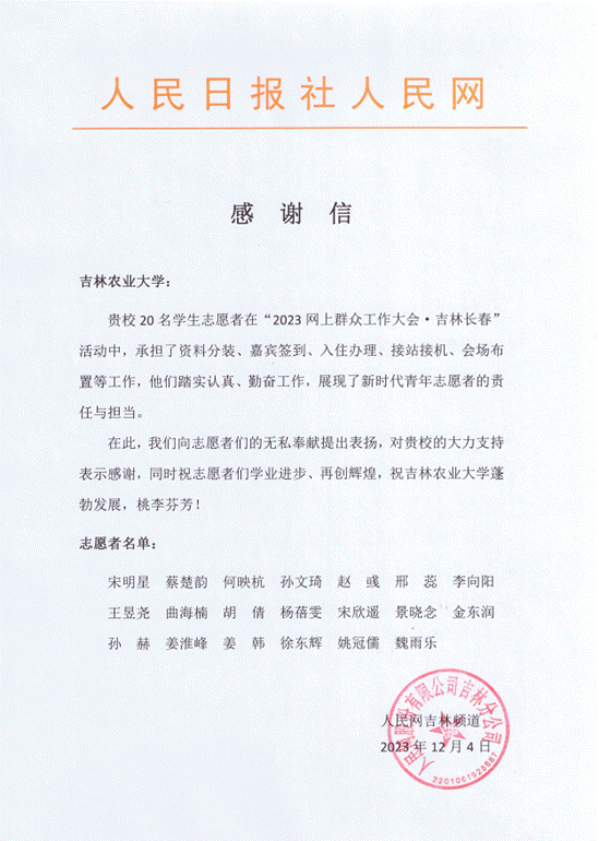 近日,由人民日报社指导,人民网、中共吉林省委办公厅、吉林省人民政府办公厅、中共吉林省委宣传部、中共长春市委主办,中共长春市委宣传部、人民网吉林频道承办的2023网上群众工作大会在吉林长春落下帷幕。我校选派农学院20名学生担任大会志愿者,他们承担了资料分装、嘉宾签到、入住办理、接站接机、会场布置等工作,受到了人民日报社人民网的表扬。