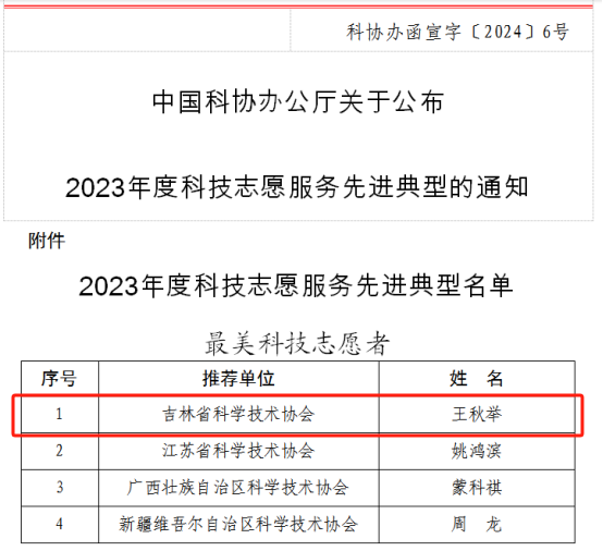 为深入贯彻落实习近平总书记关于志愿服务工作重要指示精神,大力弘扬“研当以报效国家为己任,学必以服务人民为荣光”的科技志愿服务精神,激励更多科技工作者和社会人士投身科技志愿服务事业。近日,中国科协办公厅公布2023年度科技志愿服务先进典型,我校动物科学技术学院、动物医学院副教授王秋举荣获2023年度最美科技志愿者,是吉林省唯一入选者,全国共30人入选。