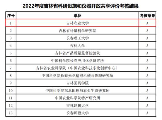 近日,吉林省科技厅发布2022年度吉林省科研设施和仪器开放共享评价考核结果,吉林农业大学荣获“A”等次,并排名第一。本次考核结果分A、B 、C三个等次,共有13个单位荣获“A”等次。
