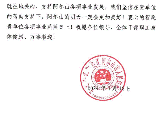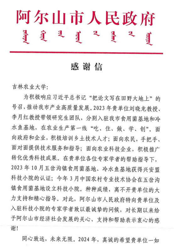 近日,内蒙古自治区兴安盟阿尔山市政府向我校发来感谢信,向学校及入驻科技小院的专家学者致以最诚挚的问候,对长期以来给予阿尔山市经济社会发展的关心、支持和帮助表示衷心的感谢!