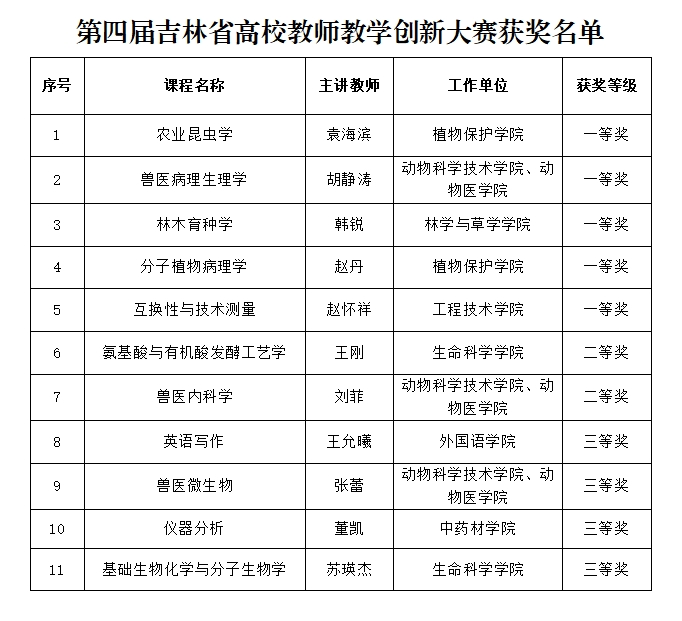 近日,由吉林省教育厅、吉林省总工会主办的第四届吉林省高校教师教学创新大赛获奖名单揭晓。大赛共评选出一等奖70项、二等奖102项、三等奖159项。经过网络评审和现场评审过程的激烈角逐,我校以袁海滨、胡静涛、韩锐、赵丹、赵怀祥等为主讲教师的5个教师团队荣获一等奖,以王刚、刘菲等为主讲教师的2个教师团队荣获二等奖,以王允曦、张蕾、董凯、苏瑛杰等为主讲教师的4个教师团队荣获三等奖。其中,植物保护学院教授袁海滨主讲的课程被选拔推荐参加第四届全国高校教师教学创新大赛。