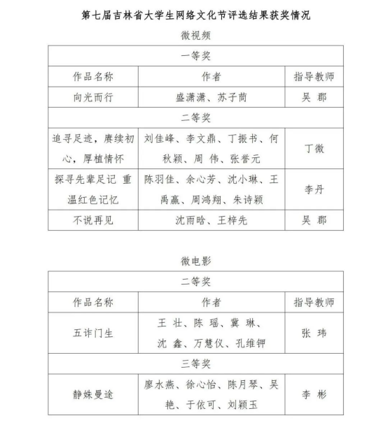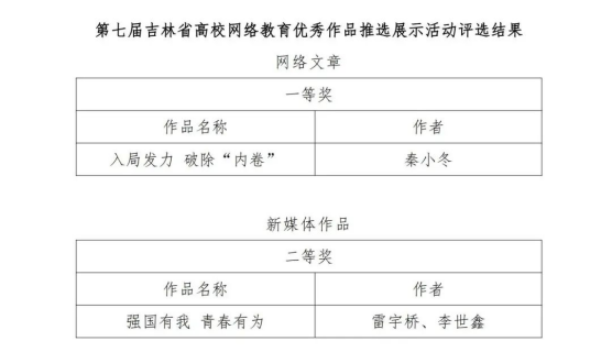 近日,省教育厅举办了第七届吉林省大学生网络文化节和全省高校网络教育优秀作品推选展示活动,共收到全省高校报送的作品1090篇,经作品审核、资格审核及专家评审等环节,共评选出2个大类13个赛道539件作品获评省级奖项。我校精心组织参与、积极报送,共计19项师生作品获奖,其中获各类作品一等奖4项,二等奖10项,三等奖5项。