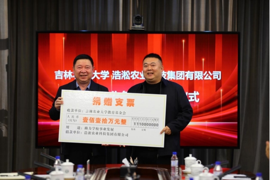 学校校友工作办公室主任程军代表学校教育发展基金会接受浩淞农业科技集团有限公司捐赠的教育发展基金110万元。