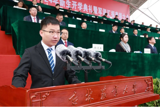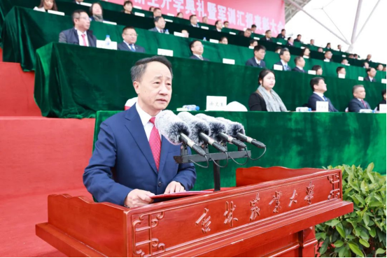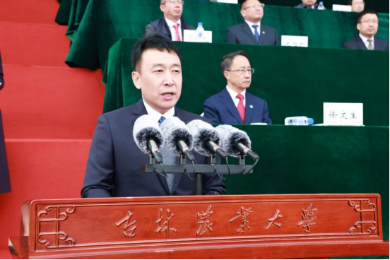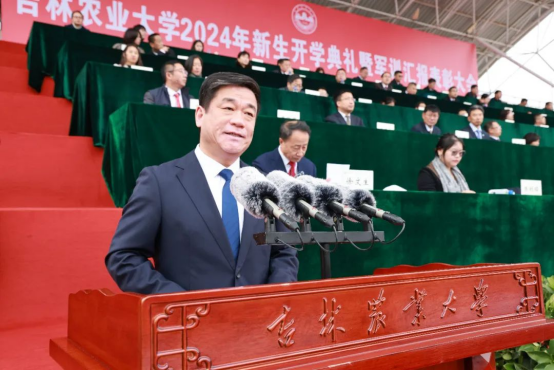 杜锐在典礼上发表讲话,他代表吉林农业大学全校师生员工,向新入学的5143名本科生、1892名硕士生和164名博士生,表示热烈的欢迎!向关爱和支持同学们成长的家长和老师致以崇高的敬意!同时,杜锐以三点希望与新同学共勉,一是希望同学们乘中华民族伟大复兴之势,做志在报国的建设者。吉林农大人的家国情怀,是溶于血液、植于基因中的精神传承。一代代吉林农大人在矢志报国的热忱中风雨同舟、接续奋斗,为国家进步和人民幸福做出了“吉林农大贡献”。希望大家传承先贤风骨,勇立鸿鹄之志,在强农报国的追求中成就更高境界的人生。二是希望同学们乘吉林农大追逐一流之势,做勇立潮头的创新者。今天的吉林农大,人才队伍更加卓越,科研实力更加雄厚,教学水平更加精湛,我们比以往任何时候都更有信心、更有能力实现“双一流”的吉林农大梦。希望大家潜心向学、敢为人先,与吉林农大双向奔赴、顶峰相见。三是希望同学们乘青春朝气蓬勃之势,做砥砺前行的奋斗者。奋斗是青春最亮丽的底色,行动是青年最有效的磨砺。希望大家珍惜青春时光、把握青春之势,在“自找苦吃”的风雨磨砺中,感受中国式现代化的光明前景,努力成长为担当复兴大任的时代新人。