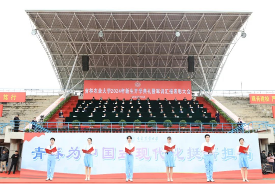 在校生代表和新生代表共同表演了《铭记校史 心向远方》主题诗朗诵。诗歌娓娓道来、饱含深情,描绘了一代代吉林农大人满怀强国富民之志,勇担强农兴农之使命,心怀“国之大者”,用实际行动将论文写在大地上。