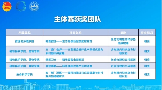 本届大赛共吸引全国2700余所高校的300多万名学生踊跃参与,累计提交39万余个创业项目。经过激烈角逐,我校获国奖5项。其中,由张忠庆等老师指导、沈志远等成员参与的“微囊智控——生态环保新型氮肥增效剂”项目荣获银奖;由张波等老师指导、李游等成员参与的“‘三菌’会师——三菌组合循环生产新模式助力乡村振兴共富路”项目,由徐伟等老师指导、史东玉等成员参与的“绿盾卫士——植物源害虫驱避剂”项目,由韩雪容等老师指导、刘雨心等成员参与的“鼎菇革新——绿色低碳皮革产业缔造者”项目和由刘秀明等老师指导,赵尚阳等成员参与的“如‘槲’添翼——高附加值红花点亮健康与乡村振兴的璀璨时代”项目荣获铜奖。