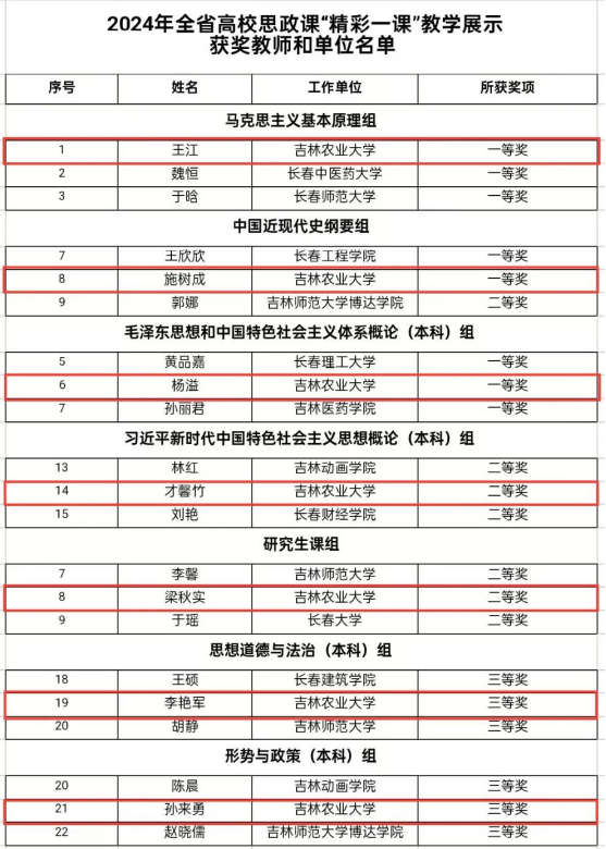 近日,2024年全省高校思政课“精彩一课”教学展示活动圆满结束,吉林省教育厅发布《关于做好2024年全省高校思政课“精彩一课” 成果展示的通知》及教学展示获奖教师和单位名单,我校马克思主义学院教师荣获一等奖3项、二等奖2项、三等奖2项,学校荣获优秀组织奖。