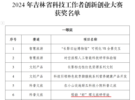 近日,2024年吉林省科技工作者创新创业大赛圆满落幕。本次大赛共收到省内高校、科研院所、科普基地等多类单位与个人申报的171个优秀项目。经专家评审等环节,最终37 个项目在激烈角逐后脱颖而出,我校《稻韵“虾”晖文旅研学途》项目荣获一等奖,《乡韵蓝莓—生态文旅的新农村梦》项目荣获优秀奖。