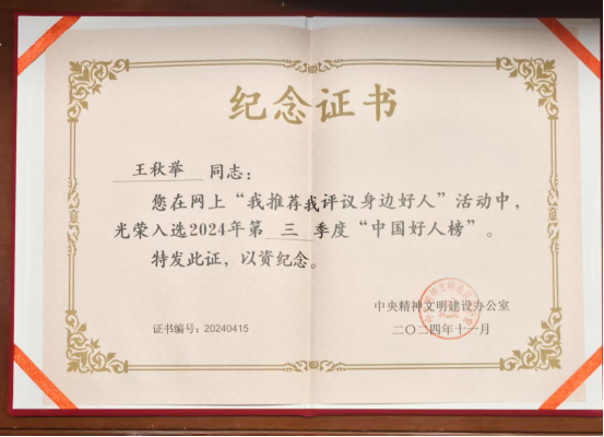 另外,在中央精神文明建设办公室举办“我推荐我评议身边好人”活动中,由中国科协推荐王秋举参加评选,并光荣入选2024年第三季度“中国好人榜”,这是我校教师首次获得此项殊荣。