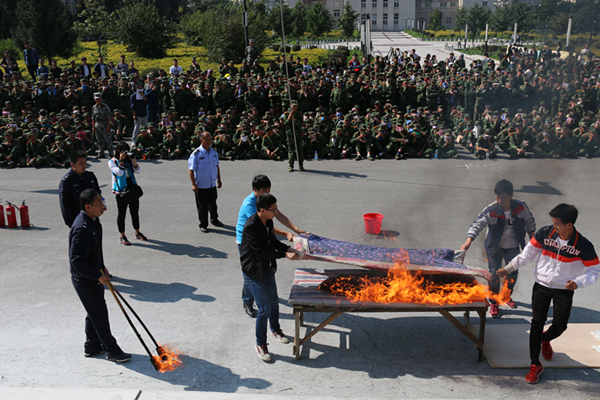 演练共分为两个部分。第一部分是模拟十一号楼发生火情,接到报警电话后,保卫处、学生工作处密切配合,成功组织4000余名师生安全疏散,逃离事故现场。第二部分是模拟油锅、电路、床铺、实验台、杂物等起火的场景,20余名新同学在保卫干警的指导下,利用锅盖、灭火毯、灭火器等器材成功将火扑灭。