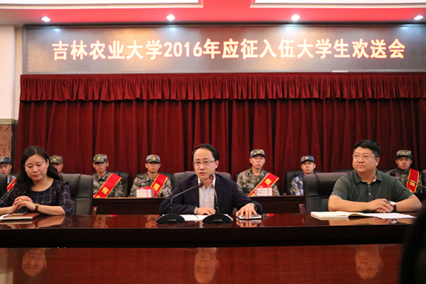 会上,学生工作处处长董雅致宣读了《吉林农业大学2016年入伍大学生名单》;动物科学技术学院毕莹、园艺学院汤海昆代表退役复学学生发言;资源与环境学院徐玉飞、工程技术学院马拾全代表入伍新兵发言。