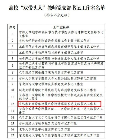 近日,中共吉林省委教育工作委员会公布吉林省高校“双带头人”教师党支部书记工作室名单,包括我校信息技术学院计算机系党支部书记工作室在内的40个高校“双带头人”教师党支部书记工作室入选。