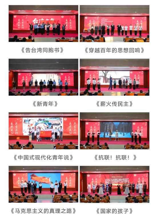 经过激烈角逐,由王楠阿雪、李艳军老师指导的《中国式现代化青年说》,王红印、李姣蓉老师指导的《国家的孩子》获一等奖;由卞靖懿、张玉婷老师指导的《告台湾同胞书》,张连奎、高迪老师指导的《新青年》,张文玲、金凤姬老师指导的《马克思主义的真理之路》获二等奖;由梁秋实、孙玥老师指导的《穿越百年的思想回响》,任航、汤慧阳老师指导的《薪火传民主》,杨溢、叶芳雁老师指导的《抗联!抗联!》获三等奖。