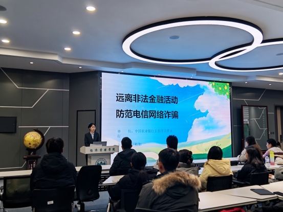 讲座中,农行净月潭支行工作人员结合校园金融风险特点,从“构建安全校园环境,防止借贷纠纷、网络诈骗,识别非法集资等陷阱,保护自身财产安全”“减少学生攀比消费、过度依赖网贷等不良行为,培养理性消费观”等方面做了详细介绍。