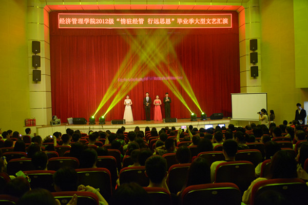 经济管理学院院长曹建民在晚会上作了讲话,他希望毕业生们秉承“明德崇智 厚朴笃行”的校训精神,心系母校,志存高远,开创自己辉煌的未来。晚会在经济管理学院自创乐队的表演中拉开帷幕,《玉簪花开的地方》《毕业歌》等歌曲的优美旋律回荡在整个活动中心,健美操协会表演的啦啦操《传奇》将晚会的气氛推向高潮。晚会上,优秀毕业生代表分享了大学经历并表达对母校培养的感激之情。