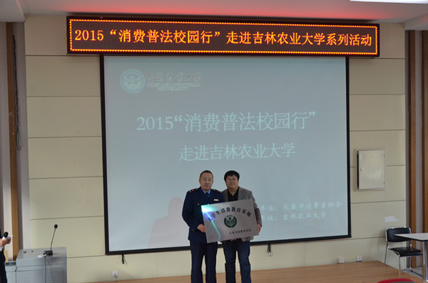 会上,长春市消费者协会副秘书长张伟介绍了2015“消费教育普法校园行”专项活动的目的意义及方案,向吉林农业大学“大学生消费维权服务基地”的建成表示祝贺并授牌。长春市消费者协会消费教育指导部主任马耘做了题目为“大学生如何树立健康科学 合理消费观念”的主题报告。随后,在十一号楼前开展了为期一周的消费安全主题教育展活动。