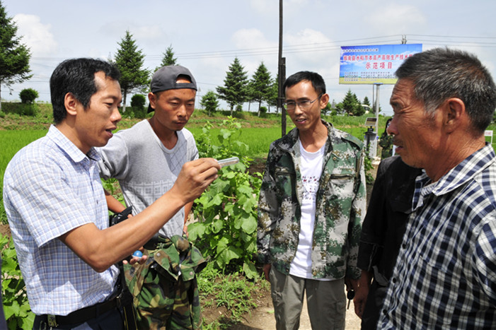 我校农业现代化研究所臧连生研究员为当地农民讲解了水稻二化螟生物防治技术,解答了农民相关疑问。