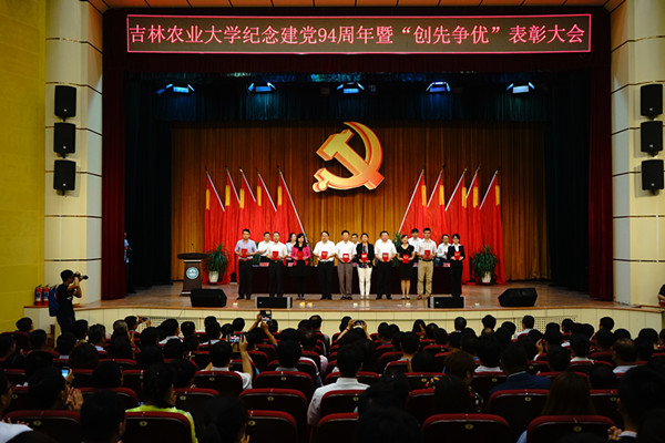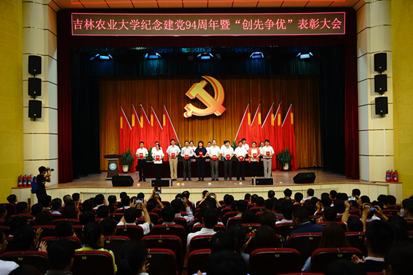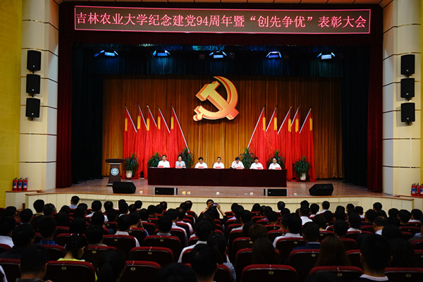 校党委书记席岫峰作了讲话,他首先回顾了中国共产党94年的光辉历程和党的十八大以来取得的伟大成就,同时对学校60余载的发展及办学取得的成绩进行了总结。他指出,面对新形势、新要求,我们要坚持推进事业发展与抓好党的建设相协调,全面落实党要管党、从严治党方针,全面落实习近平总书记关于加强和改进高校党的建设的指示精神,进一步提升党建工作科学化水平,努力为学校发展提供坚强有力的政治和组织保障。他强调,在今后工作中,我们要坚持把思想理论建设摆在首位,坚定党员干部理想信念,强化思想引领,始终把牢学习研究宣传马克思主义、培养合格建设者和接班人的正确方向。要坚持加强基层党组织建设,进一步增强党组织的凝聚力战斗力创造力,巩固夯实党的组织基础、工作基础和群众基础。要坚持抓好党员队伍建设,激励广大党员提高素质,增强党性,充分发挥先锋模范作用,形成创先争优、建功立业的良好局面。要坚持抓好党的作风建设,认真践行“三严三实”要求,以良好的党风政风带动全校形成新风正气,为学校的事业发展营造良好氛围。