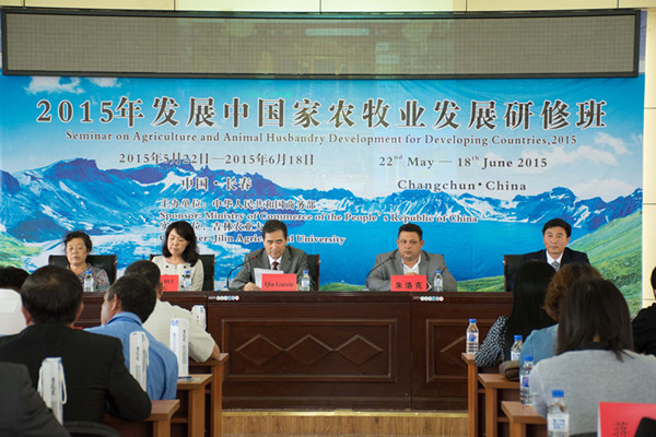 6月18日下午,由国家商务部主办、我校承办的2015年发展中国家农牧业发展研修班结业典礼在学校十七号楼报告厅举行。校长秦贵信,吉林省商务厅国际经济援助项目官员周慧芳出席了典礼。典礼由国际教育交流学院院长叶长江主持。