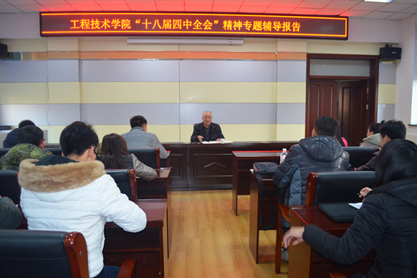 11月28日,工程技术学院在学校二十一号楼学术报告厅举办了党的十八届四中全会精神专题辅导报告会。报告会邀请了学校关心下一代工作委员会黄作林老师主讲。