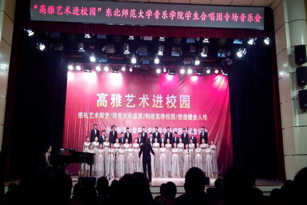 为提高在校大学生艺术欣赏水平,加强校园文化建设,10月27日,我校在鲲鹏学生文化活动中心举办了“高雅艺术进校园”—东北师范大学音乐学院学生合唱团专场音乐会。