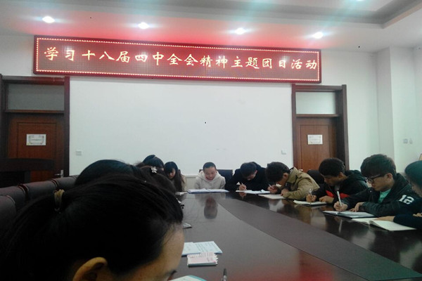 十八届四中全会期间,学院结合实际,采取集中学习、专题座谈、集中研讨等方式组织广大青年学生学习贯彻十八届四中全会精神。同时开展了“依法治国,依法治校,依法治院和依法治班”的交流与讨论。学院还通过微信公共平台和微博第一时间传递会议精神,引导和发动青年学生在微博微信上发表有关十八届四中全会的正能量言论。