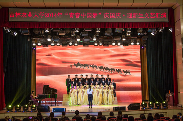 汇演在我校大学生艺术团民乐团演奏的新民乐合奏《奇迹》中拉开序幕,全国百强社团鲲鹏话剧团表演了小品《让铺》,小品以新生开学为背景,用诙谐的表演诠释了如何做一名文明大学生; 2014级新同学们表演了情景歌舞剧《你好,大学》,寄托了新同学们对美好大学生活的期待与向往;来自我校国际教育交流学院的留学生们也带来了精彩的表演;我校研究生支教团和创新创业典型团队的学生代表到晚会现场,结合自身的学习生活经历,向新同学们送上了美好的祝福。最后,晚会在校大学生艺术团声乐团参加全国大学生艺术展演的合唱曲目《大漠之夜》、《在希望的田野上》中落下帷幕。
