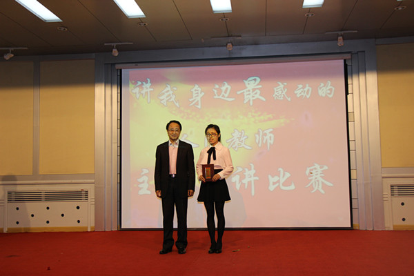 通过初选,共有八名选手进入决赛。同学们用发生在身边的点滴事例讲解了在成长过程中老师带来的感动,从不同的角度表达了对老师的感恩与喜爱。同学们富有激情、声情并茂的演讲获得台下观众阵阵掌声。最后,生命科学学院的张蕾同学获得了本次大赛的一等奖。
