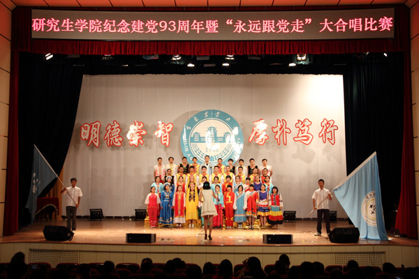 6月27日,研究生学院在鲲鹏学生文化活动中心举办了纪念建党93周年暨“永远跟党走”大合唱比赛。共有8支参赛队伍参赛,经过激烈角逐,动物科学技术学院研究生代表队演唱的《没有共产党就没有新中国》和《爱我中华》获得一等奖,农学院研究生代表队指挥张阔谭同学获评最佳指挥奖。