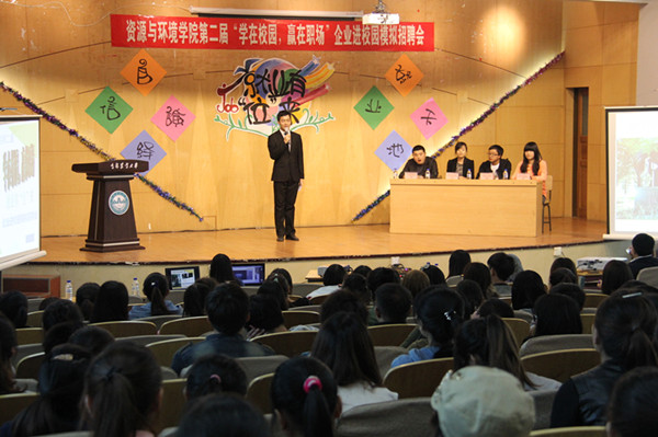 为积极引导大学生树立正确的职业观、就业观和创业观,普及大学生职业规划、创业、就业知识,充分调动学生的就业积极性,提高大学生就业能力,全面做好学生就业工作。4月29日,资源与环境学院在学校11号楼一楼报告厅举办第二届“学在校园•赢在职场”企业进校园模拟招聘会。