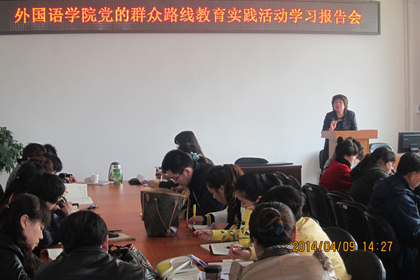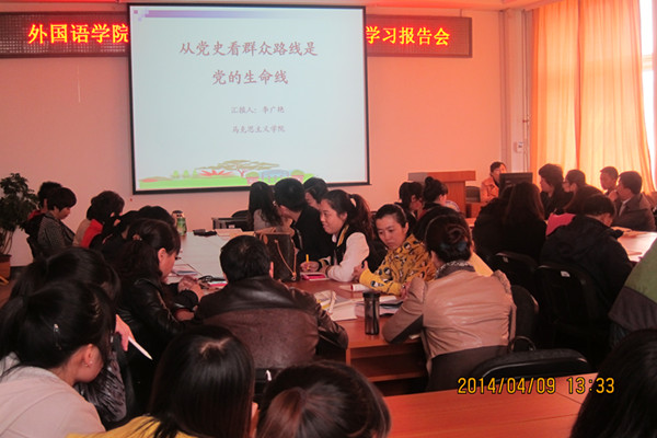 4月9日,外国语学院在学校十五号楼324道德讲堂活动室举办党的群众路线教育实践活动报告会暨外国语学院道德大讲堂活动。