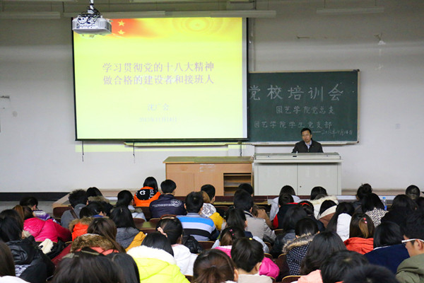 11月14日,园艺学院在学校十四号楼举办党校培训班,深入学习贯彻党的“十八大”精神及“十八届三中全会”精神。学校党委组织部组织员办公室相关同志以“学习贯彻党的十八大精神做合格的建设者和接班人”为题,对党的十八大精神及十八届三中全会精神进行了解读。