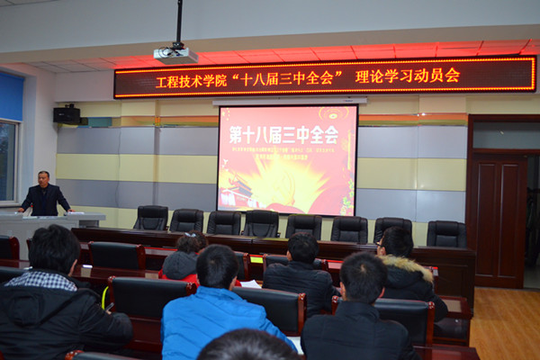 11月13日,工程技术学院在学校二十一号楼召开了学习中国共产党十八届三中全会精神理论学习动员会。会上,工程技术学院学生工作负责同志传达了党的十八届三中全会的主要内容,并号召全体党员深入贯彻学习全会精神。工程技术学院学生第一、第二党支部全体党员及入党积极分子参加了本次动员会。