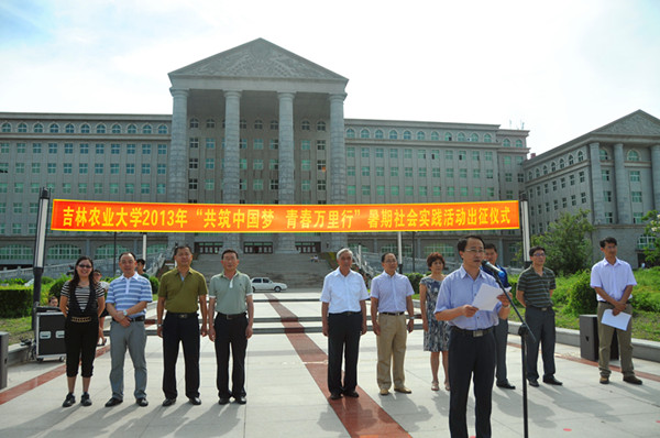 校团委书记董雅致解读了《吉林农业大学2013年青年教师参加暑期社会实践锻炼的实施方案(试行)》和《吉林农业大学2013年大学生志愿者“共筑中国梦青春万里行”暑期社会实践活动实施方案》;与会领导为2013年社会实践重点团队授旗;经济管理学院陈楠代表青年教师发言;校学生会主席王彦超同学代表参加社会实践的大学生志愿者宣誓