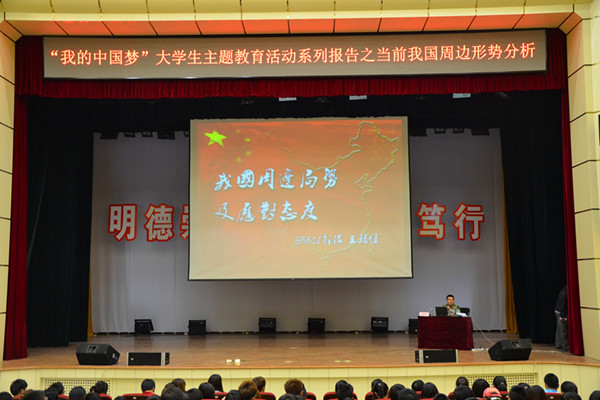 5月22日,学生工作处在鲲鹏学生文化活动中心举办了“我的中国梦”大学生主题教育活动系列报告会。65301部队电子对抗营政治教导员王福佳做了题为《浅析我国周边局势及应对态度》的专题报告,有近千名学生和学生工作人员听取了报告。