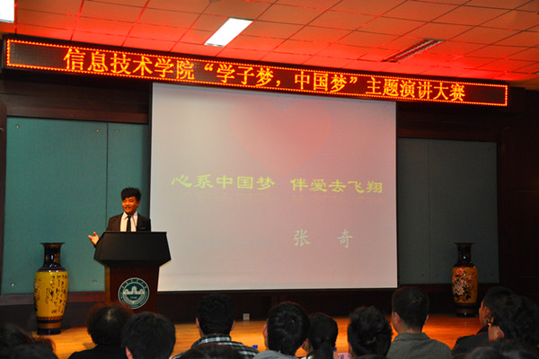 为贯彻落实我校2013 年“我的中国梦”主题教育活动方案精神,引导广大青年学生为实现国家富强、民族复兴、人民幸福的伟大“中国梦”而发奋学习、不懈奋斗,我校资源与环境学院、园艺学院、经济管理学院、信息技术学院举办了“中国梦”主题演讲比赛。