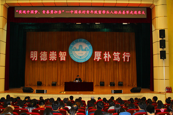 5月15日,由共青团吉林省委主办,我校承办的“我的中国梦”主题报告会之“实现中国梦、青春勇担当”中国农村青年致富带头人标兵姜军与农大师生面对面主题报告会在我校鲲鹏学生文化活动中心举行。团省委副书记牟大鹏,团省委农村青年工作部部长赵宏锦,学校党委常委、组织部部长徐文生出席了报告会。报告会由校团委书记董雅致主持。