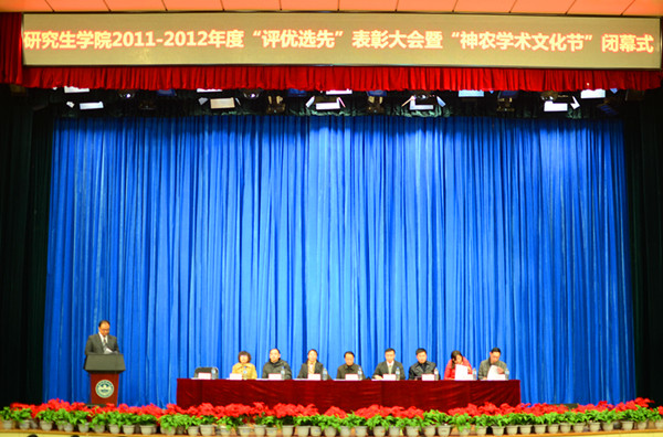12月25日,研究生学院2011—2012年度“评优选先”表彰大会暨“神农学术文化节”闭幕式在鲲鹏学生文化活动中心隆重举行。