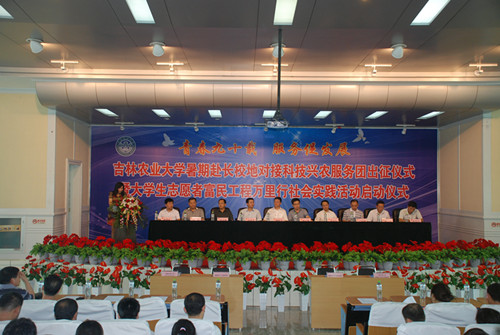 为贯彻落实胡锦涛总书记在纪念建团90周年大会上的重要讲话精神和《教育部等部门关于进一步加强高校实践育人工作的若干意见》精神,结合学校科技与社会服务年工作要求,7月18日,学校在中心教学楼国际报告厅隆重召开吉林农业大学暑期赴长校地对接科技兴农服务团出征仪式暨大学生志愿者富民工程万里行社会实践活动启动仪式