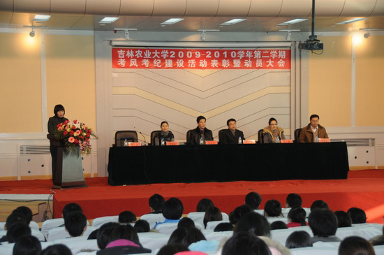 会上,校团委书记董雅致宣读了《关于表彰2009-2010学年第二学期考风考纪建设活动先进集体的决定》。与会领导为372个“考试无违纪班级”、23个“考试无违纪年级”和4个“考风考纪建设先进学院”的获奖集体代表颁发了奖状。生命科学学院2008级生物工程专业赵鹏、农学院2008级辅导员王成章、人文学院党总支副书记王军政分别代表获奖集体做了发言。学生处副处长王长海宣读了《关于加强期末考试考风考纪建设工作的通知》,针对本学期期末考试考风考纪建设工作提出了具体要求。学生处处长丁庆东对受到表彰的学院、年级和班级表示祝贺,对即将开始的期末考试进行了总动员。