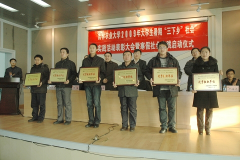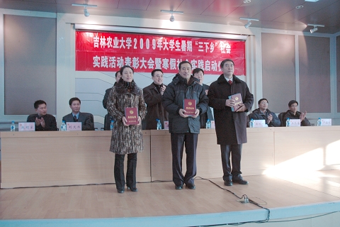 会上,赵明家宣读了《关于表彰2009年大学生暑期“三下乡”社会实践活动“先进集体”“优秀个人”的决定》。与会领导为获奖的优秀个人和先进集体颁发了奖品和证书。生命科学学院学生武彪、资源与环境学院团委书记苑淑玲分别代表大学生社会实践活动积极分子和先进集体在会上发言。董雅致宣读了《吉林农业大学2009年大学生寒假社会实践活动方案》,标志着我校2009年大学生寒假社会实践活动正式启动。